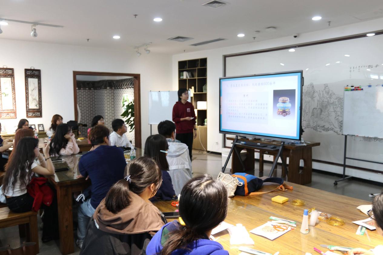 随后,新生们来到基地25楼的诸子讲堂,开启掐丝珐琅体验课。主讲人张维昊以鲜活有趣的开场方式点亮全场。他以秋分节气为切入点,结合时节气候、物候特征,系统讲解秋分的起源故事、传统习俗,以及其在中华传统文化体系中的独特价值。生动详实的知识点为新生打开认知秋分的全新视角,现场氛围逐步升温。