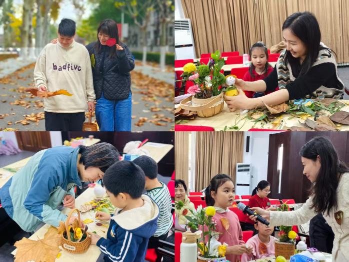 在花艺专业指导倪红老师的讲解中,大家了解了校园植物之名,欣赏秋风与落叶的合奏,探索校园之美。活动参与者穿梭在校园的林荫道与绿地间,捡拾地面上形态各异、色彩斑斓的落叶,发挥想象力与创造力,将一片片平凡的落叶进行拼贴、组合与再创作,点缀上当季的鲜花绿植,一个个充满童趣与艺术感的落叶插花艺术作品便跃然眼前,大家分享了自己的艺术创作历程。