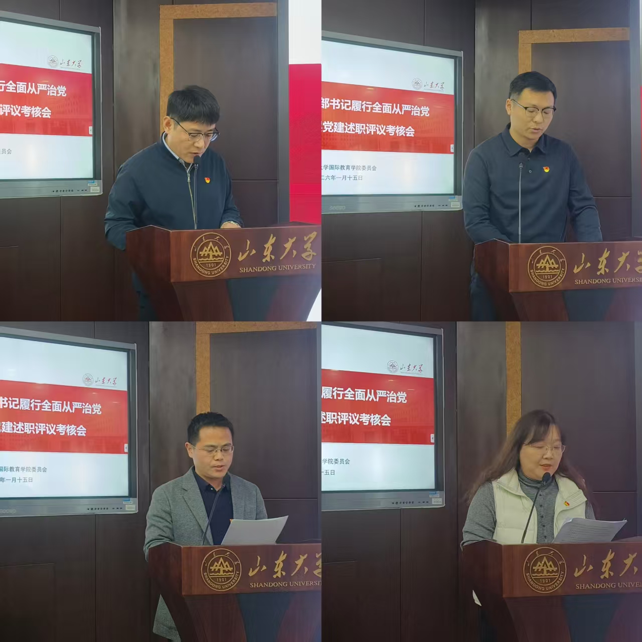 会议采用“一述一评”的方式进行。6位教工党支部书记、副书记和1位学生党支部书记代表进行现场述职,其他学生党支部书记进行书面述职。各位党支部书记重点从履行全面从严治党责任和抓基层党建工作情况展开汇报,述职中既总结了工作“亮点”,也查摆了存在的“薄弱点”并分析原因,提出了切实可行的改进举措。每位党支部书记现场述职完毕后,党委书记和联系党支部的党委委员逐一做了点评,肯定工作成绩的同时,指明努力方向,提出工作建议。