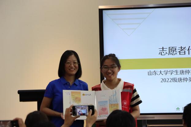 山东大学学生唐仲英爱心社活动实践部部长、2022年唐仲英德育奖学金获得者于晓涵作为志愿者代表发言,分享了此次志愿服务的感受以及将公益精神践行到底的决心。于勤老师向志愿者们赠送了学员们一起制作的爱心留言册,字字句句表达着学员们对志愿者们辛勤付出的衷心感谢。