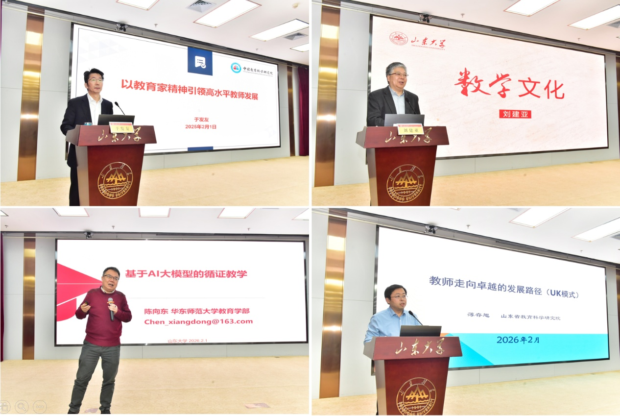 本次集中研修期间,学校安排四场专题讲座,为参训教师带来精神引领与理论滋养。于发友以《以教育家精神引领高水平教师发展》为主题讲授开班第一课,助力参训学员强化理论素养、筑牢精神根基;中国科学院院士、山东大学讲席教授刘建亚作《数学文化与素数的故事》分享,引导教师提升学科素养、树立科学精神;华东师范大学陈向东教授阐释《基于AI大模型的循证教学》,助力教师提升数智化教学素养;山东省教育科学研究院副院长薄存旭教授解析《卓越教师专业发展路径的UK模式》,拓展教师国际视野与专业发展路径。