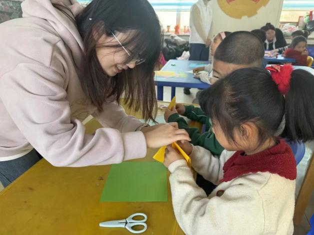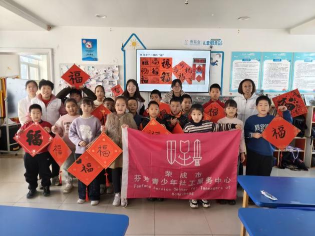 “山海春芳”支教队赴威海荣成,结合“三个课堂”开展实践,为芬芳斥山儿童服务站的孩子们带来新春年俗特别活动,带领当地孩子开展写“福”字、剪窗花等传统民俗活动,结合蜡染、绒花等非遗技艺课程,让孩子们在浓郁年味中探寻传统习俗脉络。