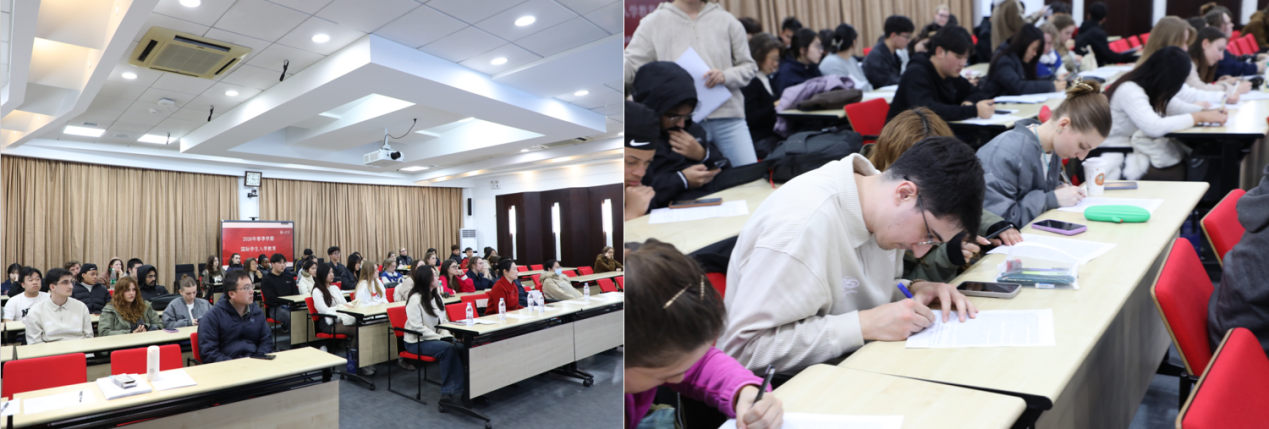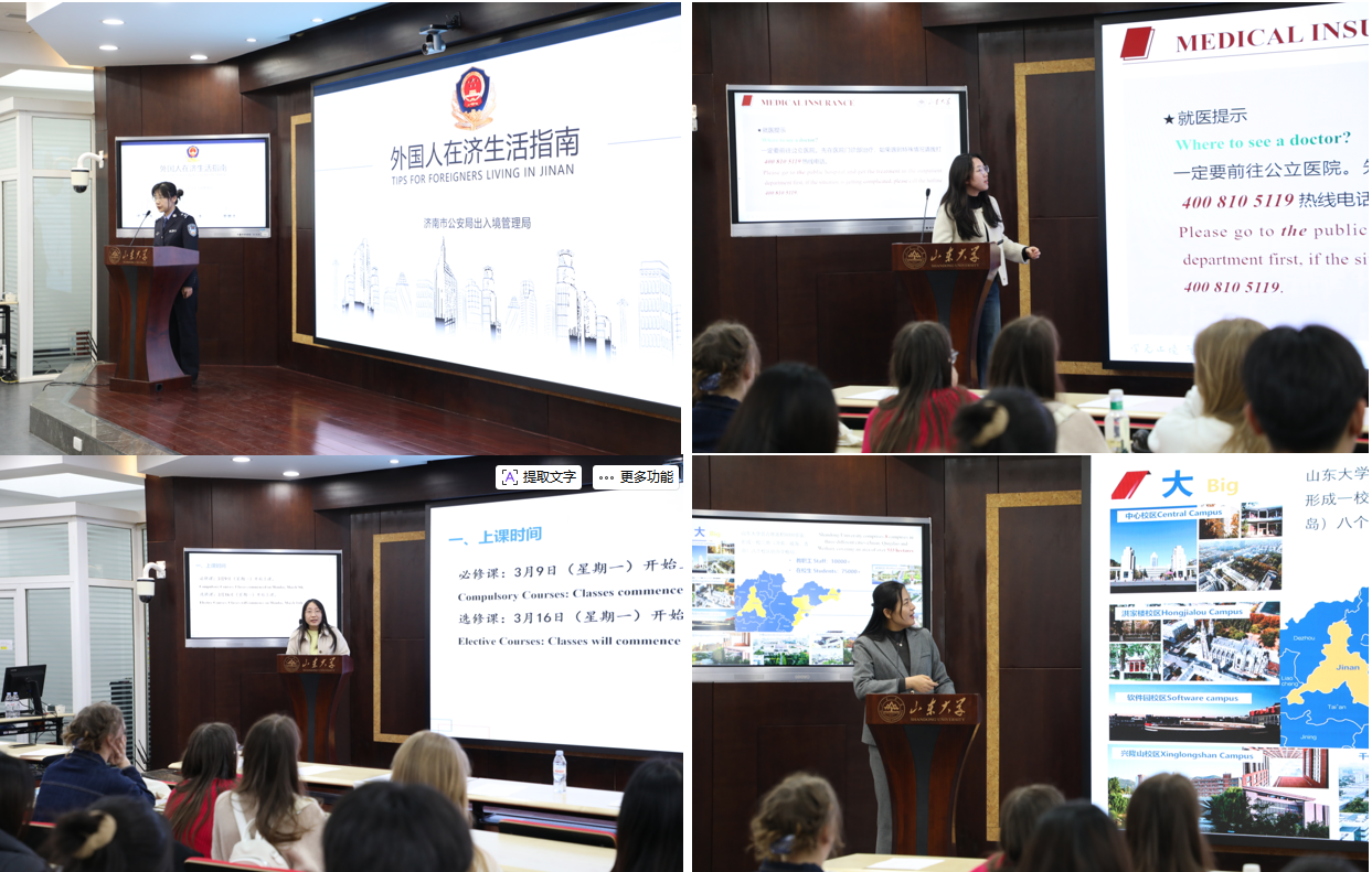 济南市公安局出入境管理局警官受邀为新生作法律法规专题教育。警官围绕中国出入境管理法律法规、外国人停留居留管理规定、防范“三非”等内容进行了系统讲解,并结合实际案例,提醒学生增强法律意识,引导学生树立法治观念,为平安留学打下坚实基础。